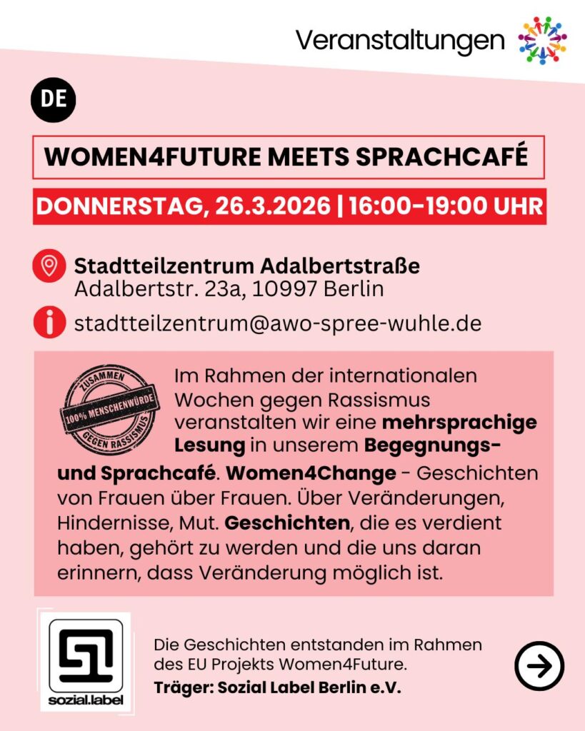 Die Veranstaltung wurde in Kooperation mit dem Träger des Projekts sozial.label e.V. mdurchgeführt. Das Projekt Women4Future wird von der Europäischen Union finanziert.